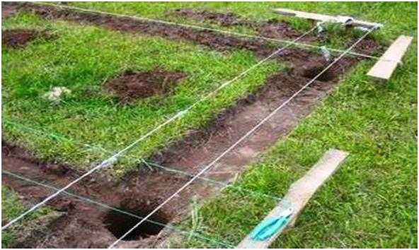 - Разметка участка, на котором будет происходить создание основания. Перед разметкой стоит создать чертеж, на котором будет указано точное расположение гаража на участке, а также его размеры.