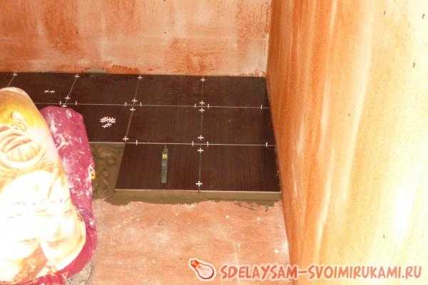 Пол делают соответственно основанию дома. Если установлены лаги из дерева, на них укладывают специальную фанеру для помещений с повышенной влажностью. Следующий слой – гидроизолятор, поверх которого настилается арматурная сетка. Затем на пол выкладывается плитка и/или мозаика.