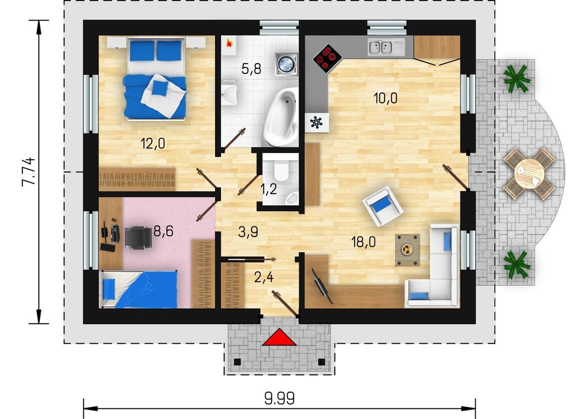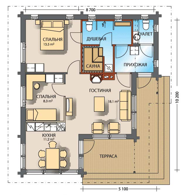 Рассмотрим еще один вариант планировки одноэтажного дома с тремя спальнями и террасой. Он отличается положением «влажного» блока — кухни/ванной/котельной/туалета. Они перенесены на противоположную сторону. Площади спальных комнат «выровнены» за счет уменьшения площади кухни. Обратите внимание: тамбур сделан выносной.