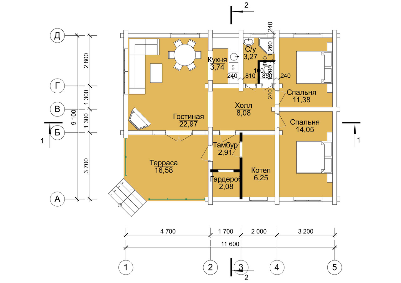 Одноэтажный дом со спальными комнатами в мансарде