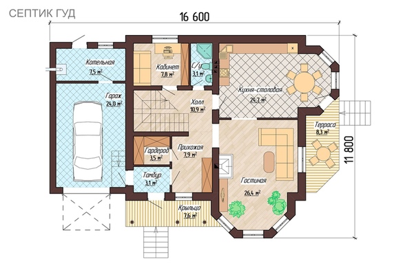 Эти два момента уже частично определяют планировку вашего дома — гостиная должна иметь выход на южную или восточную сторону.