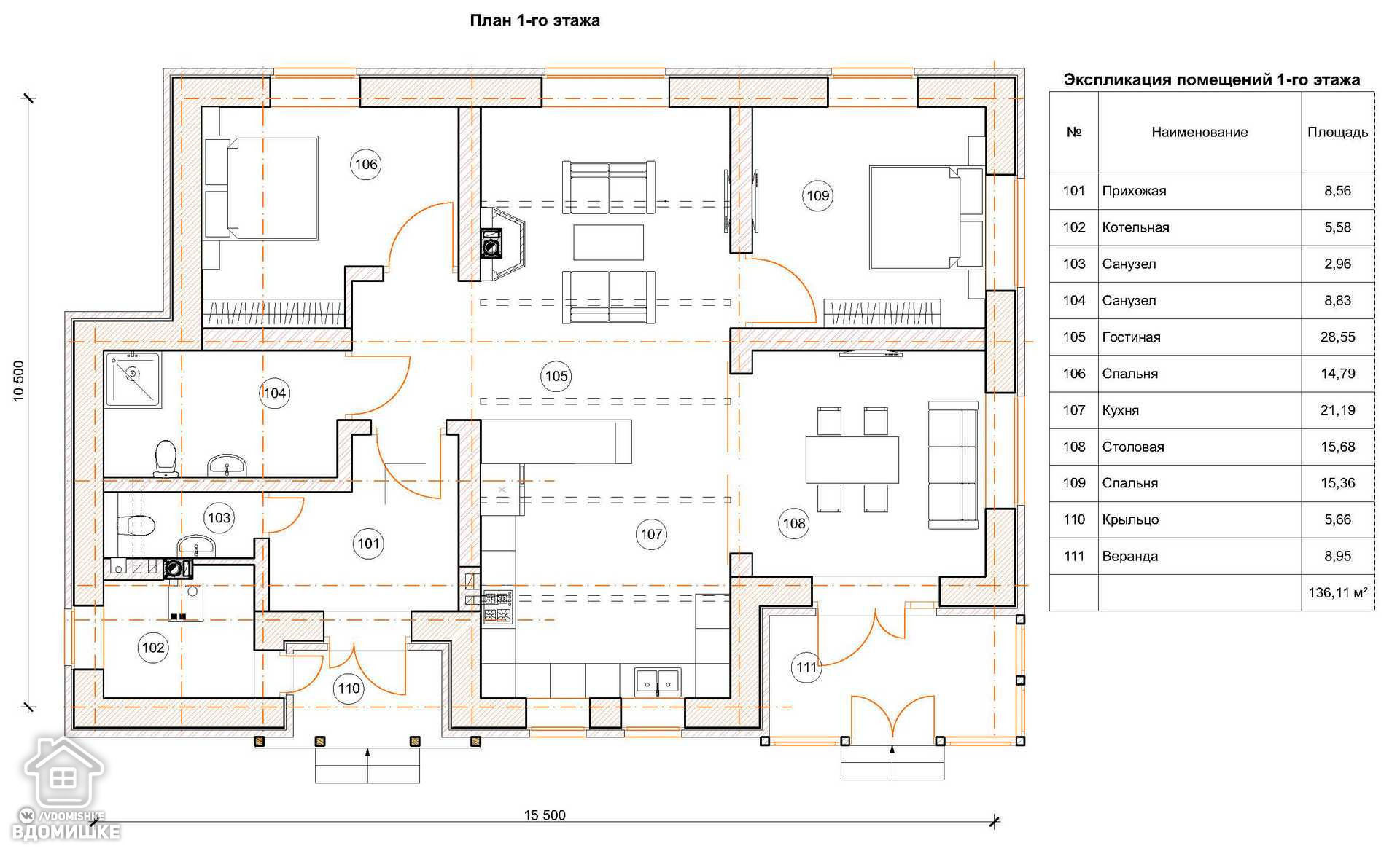 - Все помещения, где требуется подведение воды/канализации (кухня, ванна, туалет, котельная) располагать лучше рядом. Так инженерные системы будут проще, меньше потребуется материалов, получится значительно дешевле.