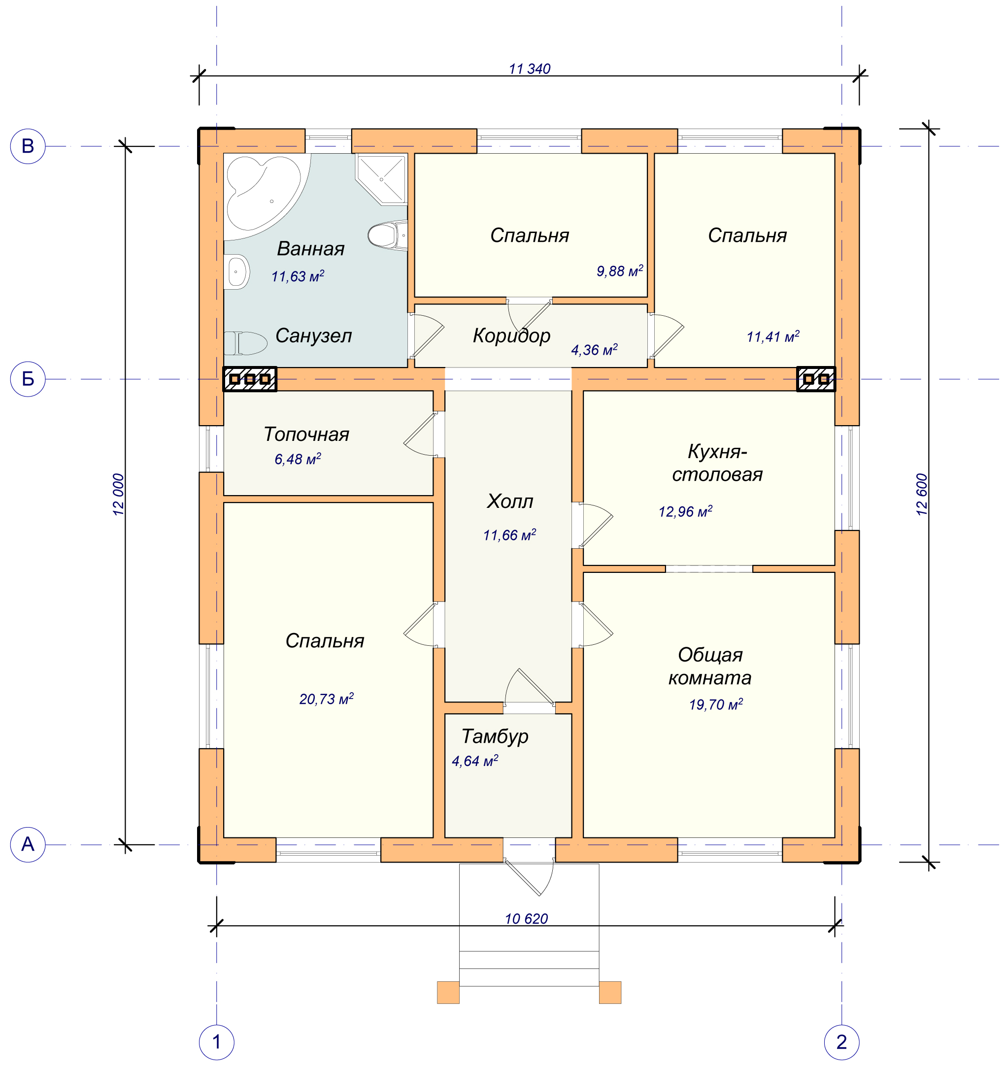 Такой, дом с Г-образной планировкой по стоимости выходит более дорогим, чем прямоугольный или квадратныйВариант 1: без коридора