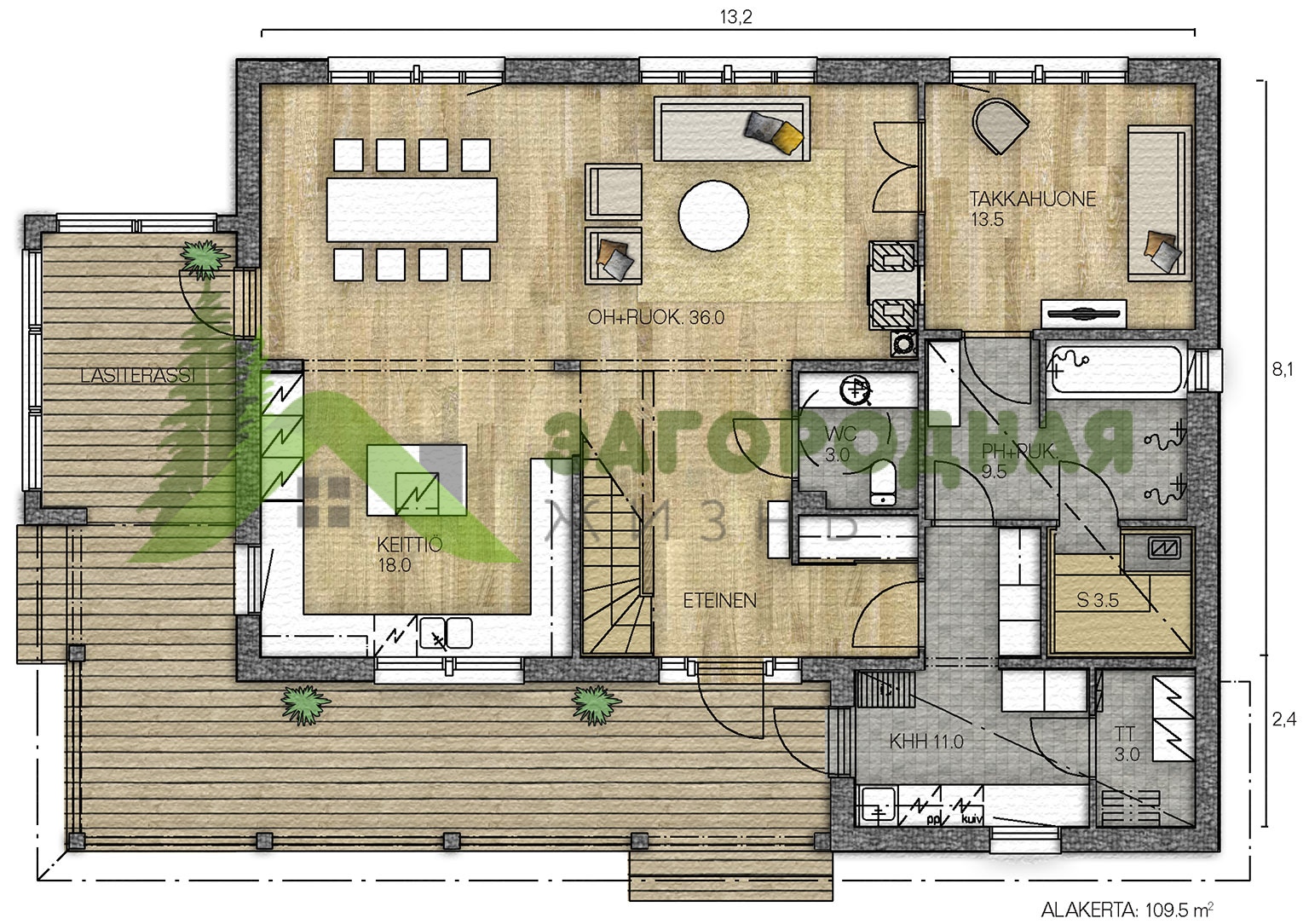 Но это еще не все, что надо учесть при планировании террасы. Есть третий момент — ее размер. Тут подход индивидуальный — кому-то требуется много места, кому-то достаточно поменьше. Интересный вариант — Г-образная терасса, которая охватывает южную и восточную стены строения. Если ее остеклить, можно превратить в летний сад… Если вам это интересно.