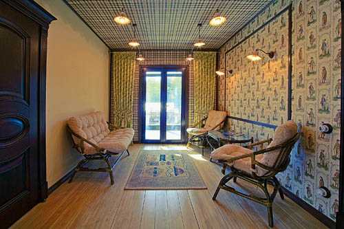 Возвращаемся к лестнице, поднимаемся на второй этаж. Холл второго этажа, необычайный по расцветке стен, штор и потолка, называется «холл садовника». Это потому, что из него мы попадаем в зимний сад, – помните, на остекленном балконе? Отсюда же двери ведут и в жилую зону – три спальни и ванную комнату.