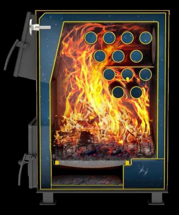 - Вокруг камеры сгорания размещена водяная рубашка с теплоносителем. В зависимости от «продвинутости» конструкции, рубашка может иметь развитые теплообменники. На иллюстрации изображены поперечные трубы в разрезе. Чем эффективнее будет отдаваться тепло от огня, тем выше КПД котла.