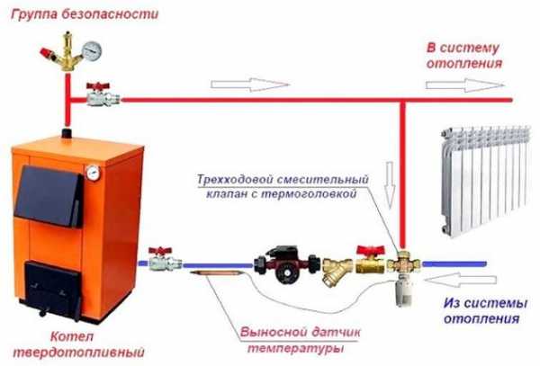В этом случае можно накапливать тепло с помощью электро ТЭНа, используя его в период низкой тарификации (например, ночью). Затем организовать отопление твердым топливом, с тепловым резервированием от бойлера. - Еще одна проблема — конденсат на топке изнутри. Неработающая камера сгорания твердого топлива, совместно с горячим теплоносителем, провоцирует каплеобразование. Это приводит к нежелательной коррозии. Чтобы предотвратить это явление, устанавливают малый контур с трехходовым клапаном.