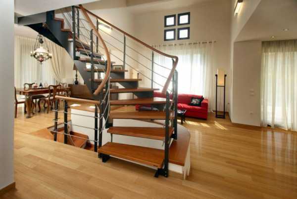 Лестница винтового типа отличается небольшими размерами, поэтому она легко устанавливается в самой маленькой комнате. В ее составе присутствуют как прямолинейные, так и криволинейные маршевые участки.