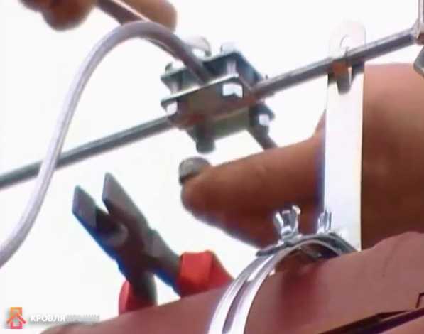 Π‘ΠΎΠ΅Π΄ΠΈΠ½Π΅Π½ΠΈΠ΅ ΡΠΎΠΊΠΎΠΎΡΠ²ΠΎΠ΄Π° Ρ Π·Π°Π·Π΅ΠΌΠ»Π΅Π½ΠΈΠ΅ΠΌ- ΠΡΠ»ΠΈ Π½Π° ΠΊΡΡΡΠ΅ ΠΈΠΌΠ΅ΡΡΡΡ Π½Π°Π΄ΡΡΡΠΎΠΉΠΊΠΈ, Π½Π°ΠΏΡΠΈΠΌΠ΅Ρ, ΠΊΠ°ΠΌΠΈΠ½Π½Π°Ρ ΡΡΡΠ±Π° ΠΈΠ»ΠΈ Π°Π½ΡΠ΅Π½Π½Π°, ΡΠΎ Π½ΡΠΆΠ½ΠΎ ΠΏΠΎΠ±Π΅ΡΠΏΠΎΠΊΠΎΠΈΡΡΡΡ ΠΈ ΠΎΠ± ΠΈΡ Π·Π°ΡΠΈΡΠ΅. ΠΠ»Ρ ΡΡΠΎΠ³ΠΎ ΠΏΡΠΈΠΌΠ΅Π½ΡΡΡ ΡΡΠ΅ΡΠΆΠ½Π΅Π²ΡΠ΅ ΠΌΠΎΠ»Π½ΠΈΠ΅ΠΏΡΠΈΠ΅ΠΌΠ½ΠΈΠΊΠΈ, ΡΡΡΠ°Π½Π°Π²Π»ΠΈΠ²Π°Π΅ΠΌΡΠ΅ Π²Π΅ΡΡΠΈΠΊΠ°Π»ΡΠ½ΠΎ. ΠΡΠΈ ΠΏΠΎΠΌΠΎΡΠΈ ΠΊΠ»Π΅ΠΌΠΌ ΠΈ ΠΊΡΠΎΠ½ΡΡΠ΅ΠΉΠ½ΠΎΠ² ΡΠΎΠΎΡΡΠΆΠ°Π΅ΡΡΡ Π²ΡΡΠΎΠΊΠ°Ρ ΠΊΠΎΠ½ΡΡΡΡΠΊΡΠΈΡ, ΠΊΠ°ΠΊ ΠΏΠΎΠΊΠ°Π·Π°Π½ΠΎ Π½Π° ΡΠ»Π΅Π΄ΡΡΡΠ΅ΠΉ ΠΊΠ°ΡΡΠΈΠ½ΠΊΠ΅.