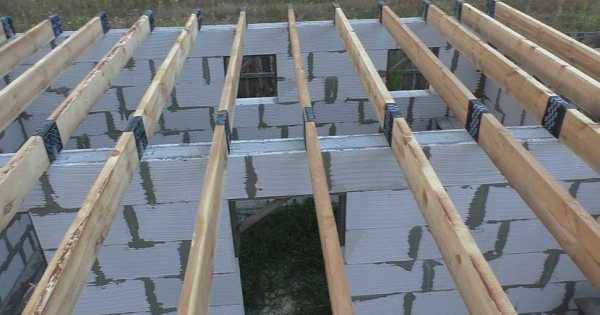 Используйте обвязочный армопояс для более надёжной фиксации. Все стропильные системы жестко фиксируют к верхнему и нижнему краю крыш. В стенках нужно заблаговременно приготовить гнезда, для укладывания перекрывающих балок. Ложить их нужно на слой гидроизоляции. На балках перекрытий прикрепляют нижнюю часть стропил. Крепкая и надежная фиксация выходит с помощью металлических накладок. Промежуточные стойки используют для придания более жёсткой конструкции.