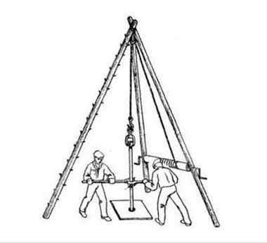 Самый простой, но и самый медленный способ пробурить скважину самостоятельно, если нет механических приспособлений, но требующий физических усилий. Хорошая замена тренажеру, прорабатываются почти все мышцы. Ударно-канатное бурение применяется на любом грунте. При одинаковой технологии и установки требуется только замена снарядов. Вся конструкция обычно устанавливается на треноге.