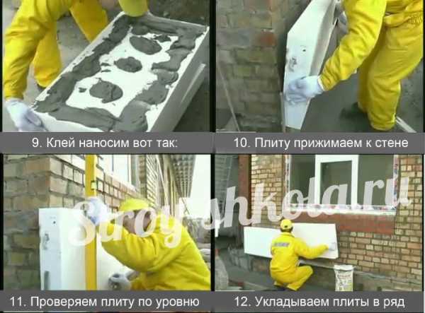 Клеевую смесь намазывают на утеплитель, а не на стену. Верхние ряды плит утеплителя по отношению к нижним располагают в Т-образном порядке.