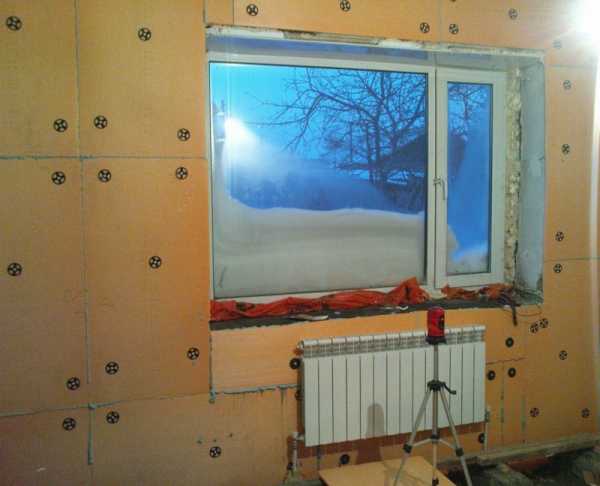 Откосы так же подлежат утеплению, но утеплителем меньшей толщины. Пенопласт для утепления откосов должен выступать 10 мм, то есть его (пенопласт) не нужно обрезать вровень со стеной.