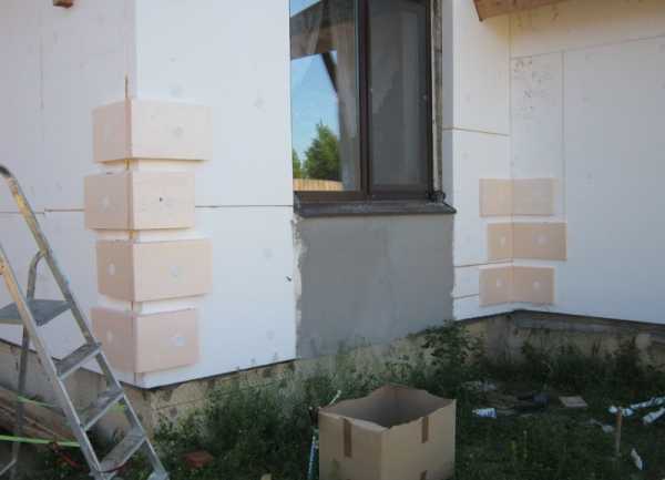 На углах фасадах производят зубчатое соединение утеплителя. Во избежание появления длинного вертикального шва плиты соответствующих рядов должны вклиниваться в поверхность смежных стен. При необходимости после обустройства углового соединения утеплитель подрезают.