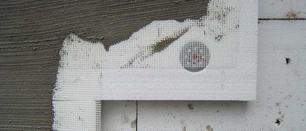 На последнем этапе производится устройство армированного слоя из сетки, который усиливает всю конструкцию. Прежде всего, закладки из армирующего материала проклеиваются на углах у дверных и оконных проемов, что позволит