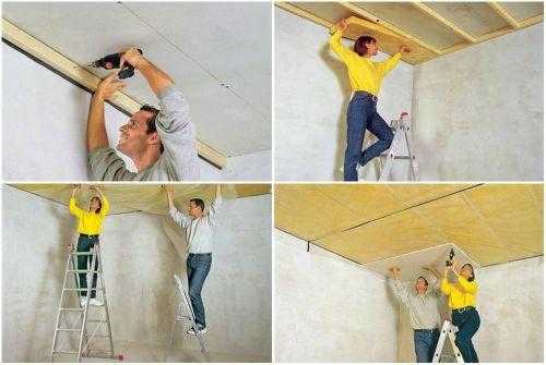 На первоначальном этапе потолок обивается пароизоляционной пленкой, после чего закрепляются профили из алюминия, на которых будет держаться навесной потолок. При помощи досок собирается конструкция, внутри которой размещается слой утеплителя. Для предотвращения порчи и лучшего сцепления с потолком, его промазывают клеем. Материал изоляции плотно укладывается, заполняя таким образом всю площадь, и снова перекрывается пленкой, исключающей увеличение влажности. Завершает работу гипсокартоновое перекрытие.