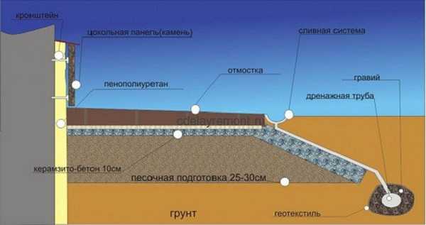 - Обустройство дренажа при наличии высокого уровня грунтовых вод.