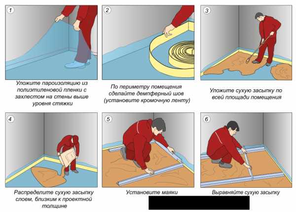 - после приступают к заливке армированной цементно-песчаной стяжки, минимальная толщина которой составляет 50 мм;
