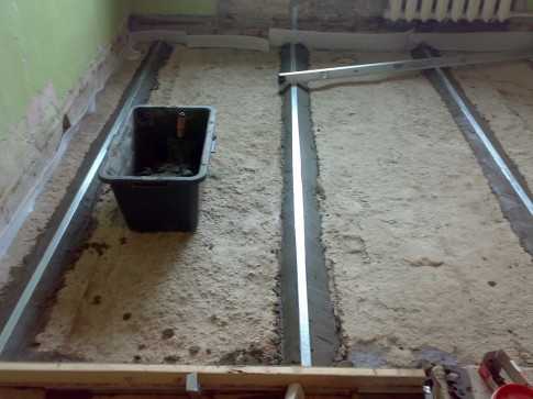 - Установите на полу маяки – отрезки перфорированного металлического профиля, которые будут обозначать верхнюю границу утепляюще-выравнивающей засыпки. Первый маяк помещается в 10 сантиметрах от дальней стены помещения, а все последующие — на равном расстоянии, параллельно друг другу, с дистанцией в метр-полтора. Верхняя часть маяков должна лежать в идеально горизонтальной плоскости. Это очень ответственный этап работы. Для выверки уровня можно использовать натянутые в помещении нити, либо все тот же лазерный уровень. Для регулировки высоты размещения профиля, под него подкладываются куски фанеры, оргалита или пластика. К поверхности перекрытия маяки-профили крепятся небольшими кучками бетонного раствора.