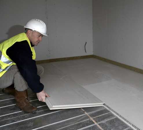 - Далее можно пойти несколькими путями, выбрав в качестве слоя, распределяющего точечные нагрузки, один из вариантов: цементно-песчаную стяжку или гипсо-волокнистые листы, монтаж которых осуществляют в два слоя.
