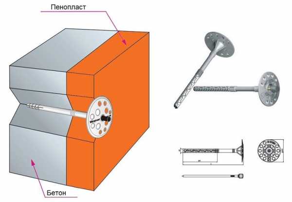 Когда клей высохнет, можно устанавливать «зонтики». Здесь все просто – сверлим отверстия, вставляем зонтик и забиваем в его середину пластиковый гвоздь. Много зонтов бить не нужно – достаточно загнать всего пять штук на лист пенопласта. Один посередине листа и по одному в каждый угол. Только теперь, когда все зонты будут установлены, можно приступать к армированию пенопласта.