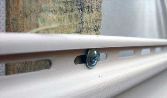 - Полимерный сайдинг обладает свойством расширяться и сжиматься при температурных перепадах. При монтаже виниловых и цокольных панелей следует это учитывать и оставлять между шляпкой крепежного элемента и панелью маленький зазор.