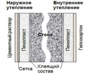 Последний вариант может применяться только при возведении стен: теплоизоляционный материал закладывается в зазоры-колодцы между внешним и внутренним слоями несущей стены, а вот теплоизоляция стен изнутри и снаружи может производиться в любое время: утеплить с помощью подобной технологии можно как новостройку, так и старое здание, переставшее должным образом удерживать тепло.