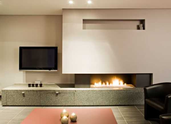 - Для функционального использования пространства подойдут эко-камины, в верхнюю часть которых можно встроить телевизор.