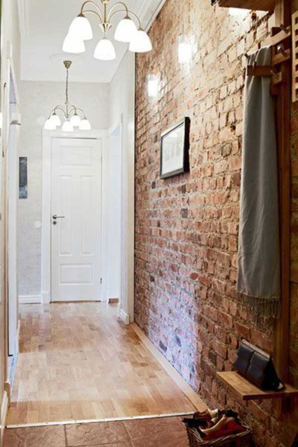 На фото — интерьер тамбура в стиле лофт с характерной отделкой стен кирпичом «под старину». Обратите внимание на сочетание напольных покрытий: плитка при входе, а дальше, вглубь прихожей — паркет. Износостойкая керамика на полу у двери — оптимальный вариант — она не истирается при контакте с песком и грязью, не набухает от влаги и легко очищается.