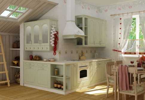 В столовой зоне и на кухне уместны будут кружевная скатерть или занавески, букеты из сухоцветов или свежих полевых цветов, кованые подсвечники или держатели для открытых полок, кованая люстра над столом, разнообразные предметы в стиле декупаж (часы, банки для сыпучих продуктов и пр.).