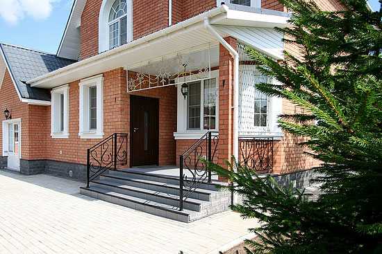 Маленький белый тамбур в форме многогранника — самобытная архитектурная конструкция на фасаде кирпичного коттеджа на фото.