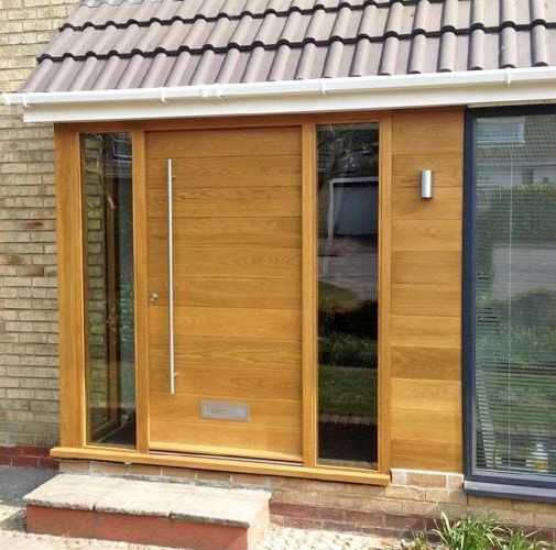 Каркас для стеклянного тамбура нередко собирают из деревянного бруса — такой вариант конструкции лучше всего подходит к архитектуре дома в стиле кантри, шато или шале.