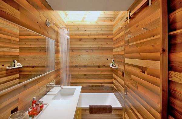 Отделка ванной комнаты натуральным деревом сделает её стильной и весьма уютной. Для такой отделки нужно использовать только влагостойкие породы дерева, а также дополнительно их обработать специальными средствами для защиты от влаги.