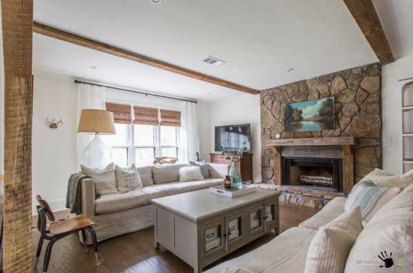 Наиболее простой и практичный способ интеграции кантри-мотивов в современный интерьер гостиной – оформление пространства вокруг камина с помощью каменной облицовки. Исполнение каминной полки с помощью грубо отесанной древесины только усиливает эффект. Как правило, для более гармоничной и сбалансированной обстановки гостиной, используются потолочные балки из дерева аналогичной породы, что и при оформлении камина.