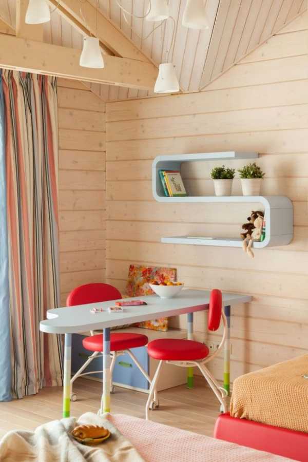 Скандинавский стиль хорошо смотрится со светлым деревом и яркими элементами мебели