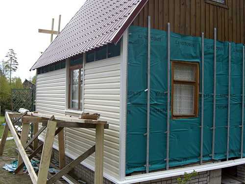 Если же процесс отделки решено совместить с утеплением, то в порядок ведения работ входит и укладка теплоизоляционного материала. Учитывая его толщину (не менее 100 мм, а в северных районах и все 150 мм), надо брать бруски для обрешетки соответствующей ширины. Причем мембрана накладывается не сразу на стену, а уже поверх утеплителя. Крепится она путем прибивания сверху планок контробрешетки толщиной 30 мм. Дальше работы производятся так же, как было описано выше.