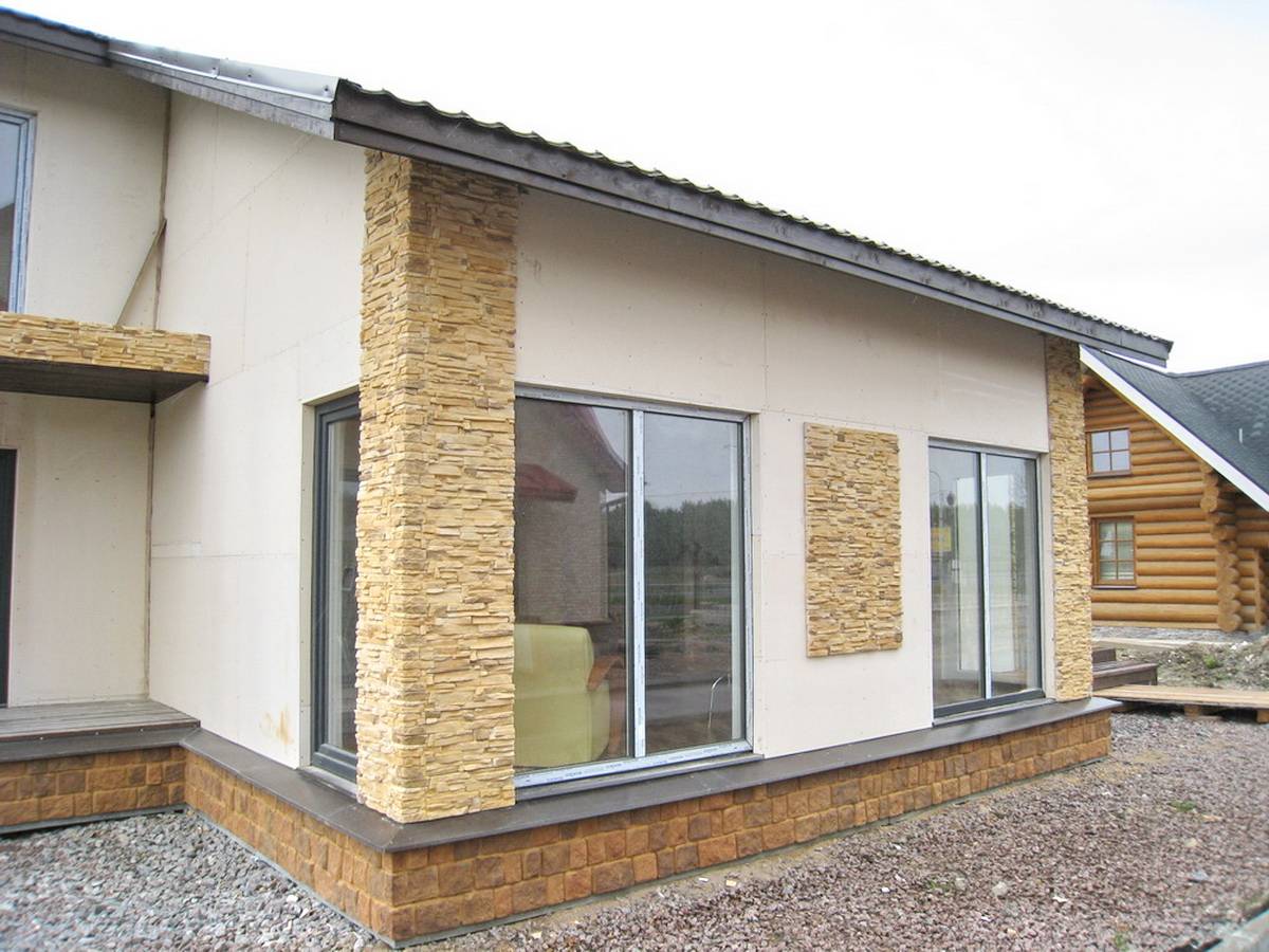 Чаще, именно двухслойный материал, который состоит из пенополистирола высокой плотности в качестве основания, а также фиброцементной, клинкерной или полимерной декоративной отделки под кирпич, камень и другие материалы.
