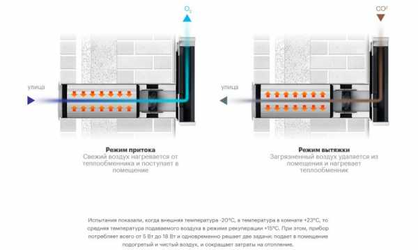 Особый вид принудительной приточной вентиляции – стеновые клапаны с функцией рекуперации. Система осуществляет частичное нагревание поступающего воздуха за счет выводимых из комнаты тепла и отработанного воздуха.