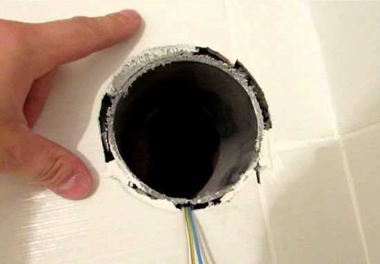 - В стене с помощью дрели с кольцевым перовым сверлом делаем отверстие необходимого диаметра