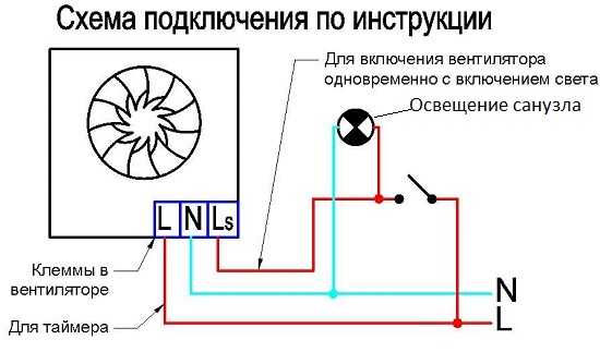 Схема подключения вентиляции зависит от самого прибора. Например, вентилятор с таймером для санузлов подключаем к освещению и распределительной коробке параллельно. При этом к клемме таймера подводка не должна разрываться выключателем.