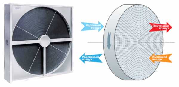 Рекуператоры роторного типа являются самыми эффективными. Их конструкция проектируются таким образом, что входящий и исходящий потоки воздуха, не смешиваясь между собой, обеспечивает вращение специализированного механизма.