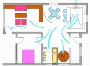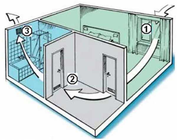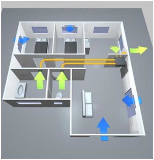 Поток свежего воздуха продвигается по комнатам, постепенно смешиваясь с отработанными воздушными массами, после чего через вытяжные каналы и удаляются из помещения.