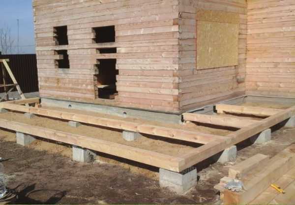 - Каркасная пристройка к брусовому дому возводится из бруса, толщина которого равняется нужной толщине стен. Вначале делается фундамент, ввиду небольшой массы конструкции он может быть мелкозаглубленным или столбчатым;