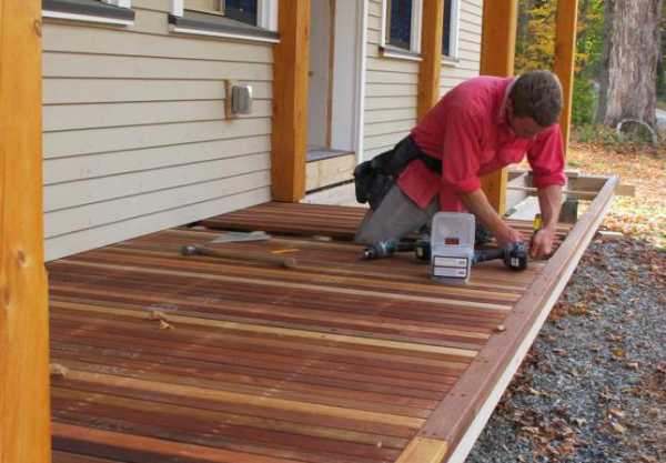 На заключительном этапе строительства в веранде набиваются полы (можно собрать их и до кладки стен). Если сооружение будет полностью открытым, для их сборки следует использовать террасную доску. Этот материал совершенно не боится влаги. Если же подобный вариант покажется хозяевам дома слишком дорогим, можно взять и обычную обрезную доску. Однако в этом случае при сборке пола стоит оставить между досками небольшие щели (2 мм). В них будет уходить попадающая внутрь веранды вода.