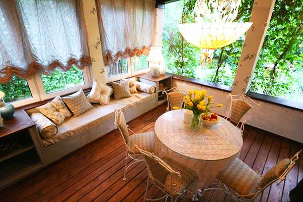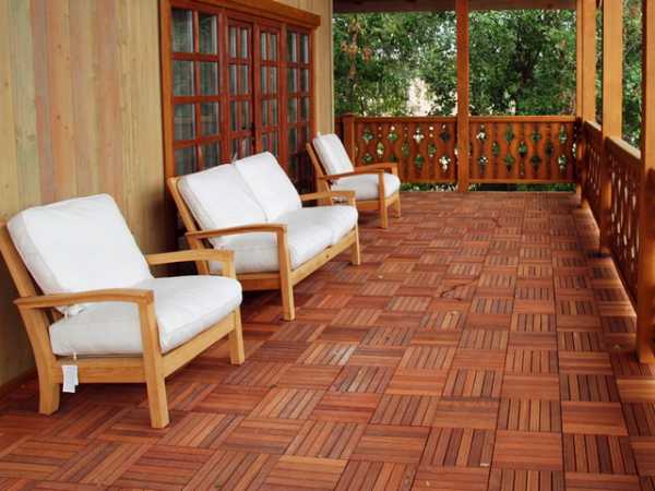 В основном отделка на веранде своими руками производится на полу и одной из прилегающих стен, поскольку остальная конструкция выполнена из деревянного каркаса и больших окон. Отделка пола должна выполняться из материалов высокого качества, способных противостоять воздействию внешней среды. В зависимости от того, какой предполагается дизайн летней пристройки, в качестве материала может использоваться доска из тика либо кедра, также популярен искусственный камень. Если веранда утепленная, то предпочтительнее использовать ламинат, линолеум или другие материалы для напольного покрытия, которые применяются в доме.