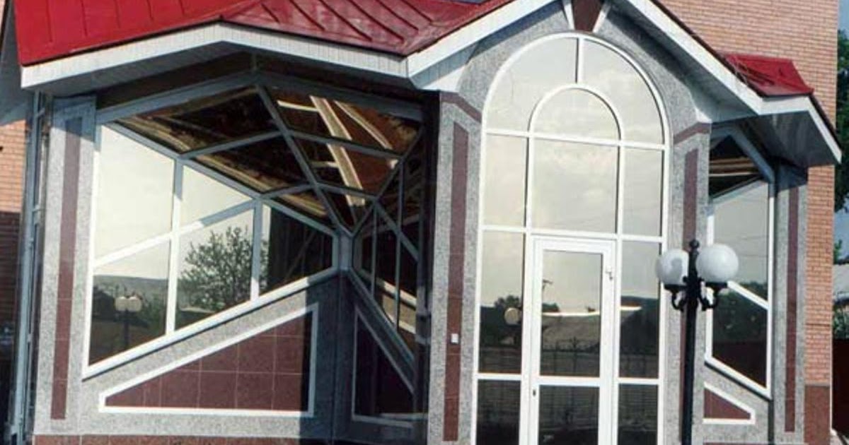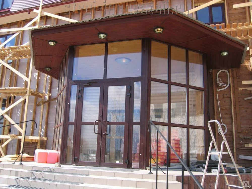 Входные группы из ПВХ-профилей закрыты со всех сторон и чаще всего пристраиваются к несущей стене здания, однако возможны и исключения. В зависимости от особенностей объекта они могут быть дополнены ступеньками, перилами и выходящим за пределы основной конструкции навесом. Иногда при их возведении используется комбинация из профильных конструкций и кирпичных, бетонных или деревянных стен.