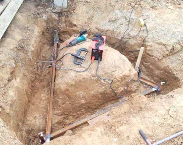 Тщательно привариваем три полутораметровых уголка к забитым в грунт электродам — уголкам, хорошо провариваем все прилегающие плоскости.