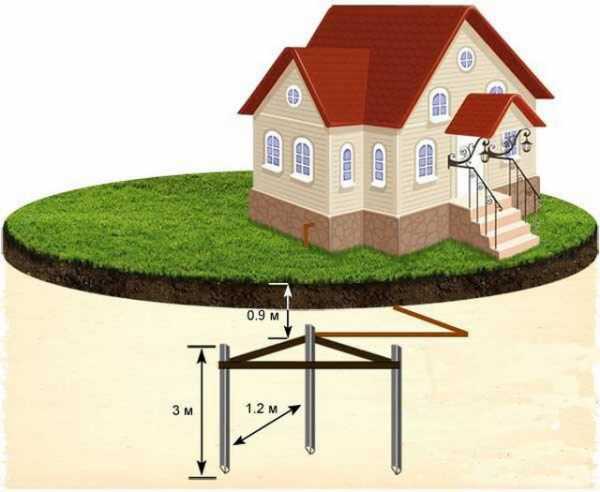 Наиболее популярная система заземления в частном доме или даче состоит из 3-х глубоко вкопанных в землю электродов и сварной конструкции из металла, которая при надобности отводит электричество. Такое количество электродов наделяет контур достаточной площадью, чтобы надёжно защитить дом среднего размера. Требования к схеме: