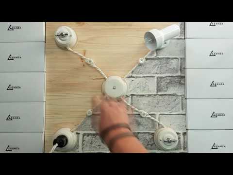 Обычно расстояние составляет 50 см между роликами и 5 см между розеткой/выключателем и первым изолятором. Фарфоровые валики крепятся шурупами. - Установите накладные розетки, выключатели и распределительные коробки антик в соответствующих местах согласно схеме.