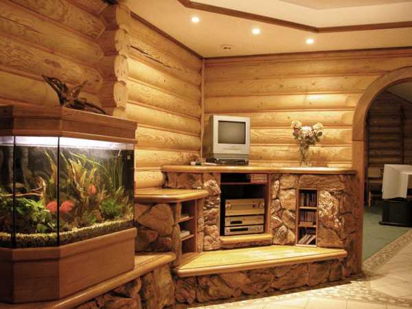 Искусственный камень использован в отделке мебели, бревенчатые стены сочетаются с двухуровневым навесным потолком